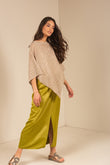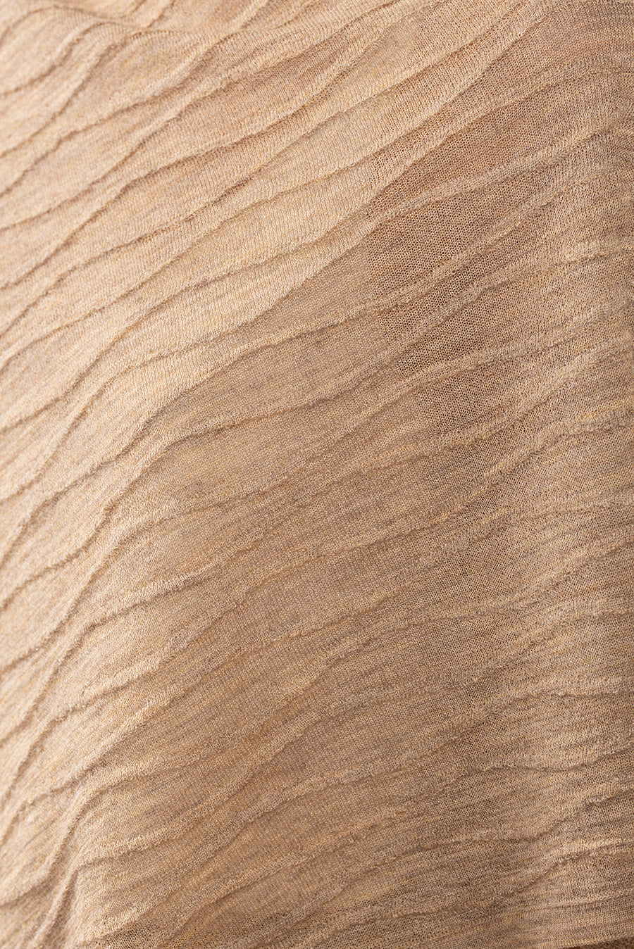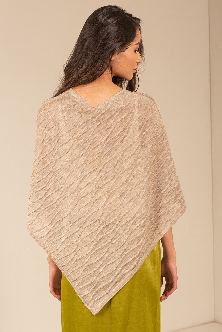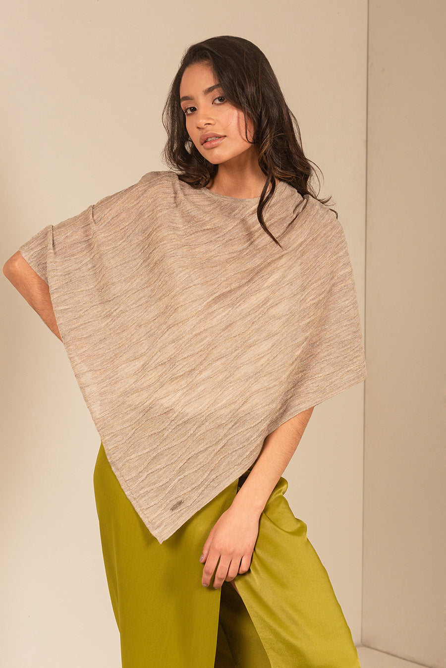 Inspirado en una apacible brisa de verano, nuestro poncho Ustinov, elaborado con hilado de baby alpaca y seda, evoca la suavidad de una caricia gracias a su agradable textura y ligera caída. | Material predominante: Baby Alpaca