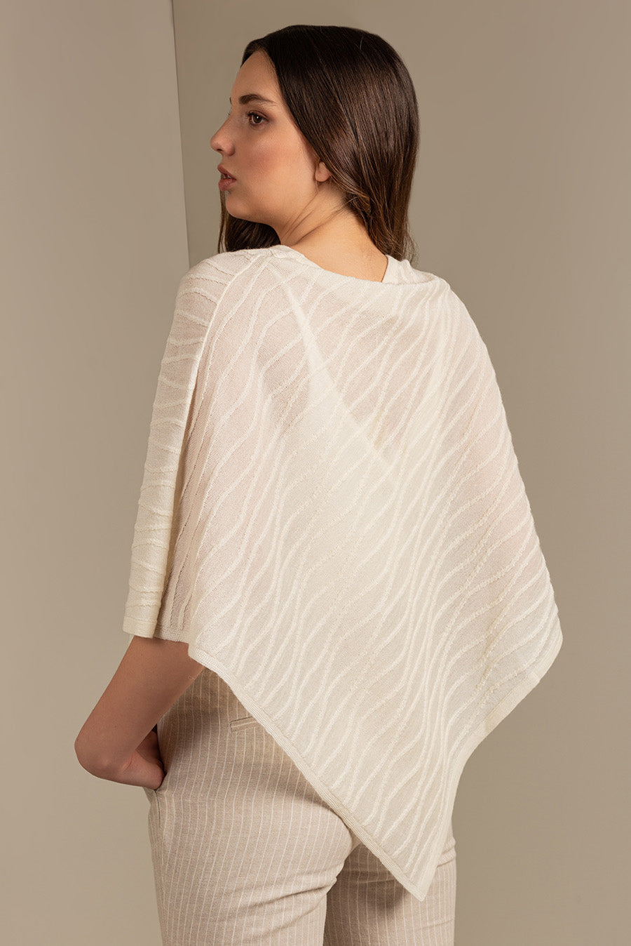 Inspirado en una apacible brisa de verano, nuestro poncho Ustinov, elaborado con hilado de baby alpaca y seda, evoca la suavidad de una caricia gracias a su agradable textura y ligera caída. | Material predominante: Baby Alpaca