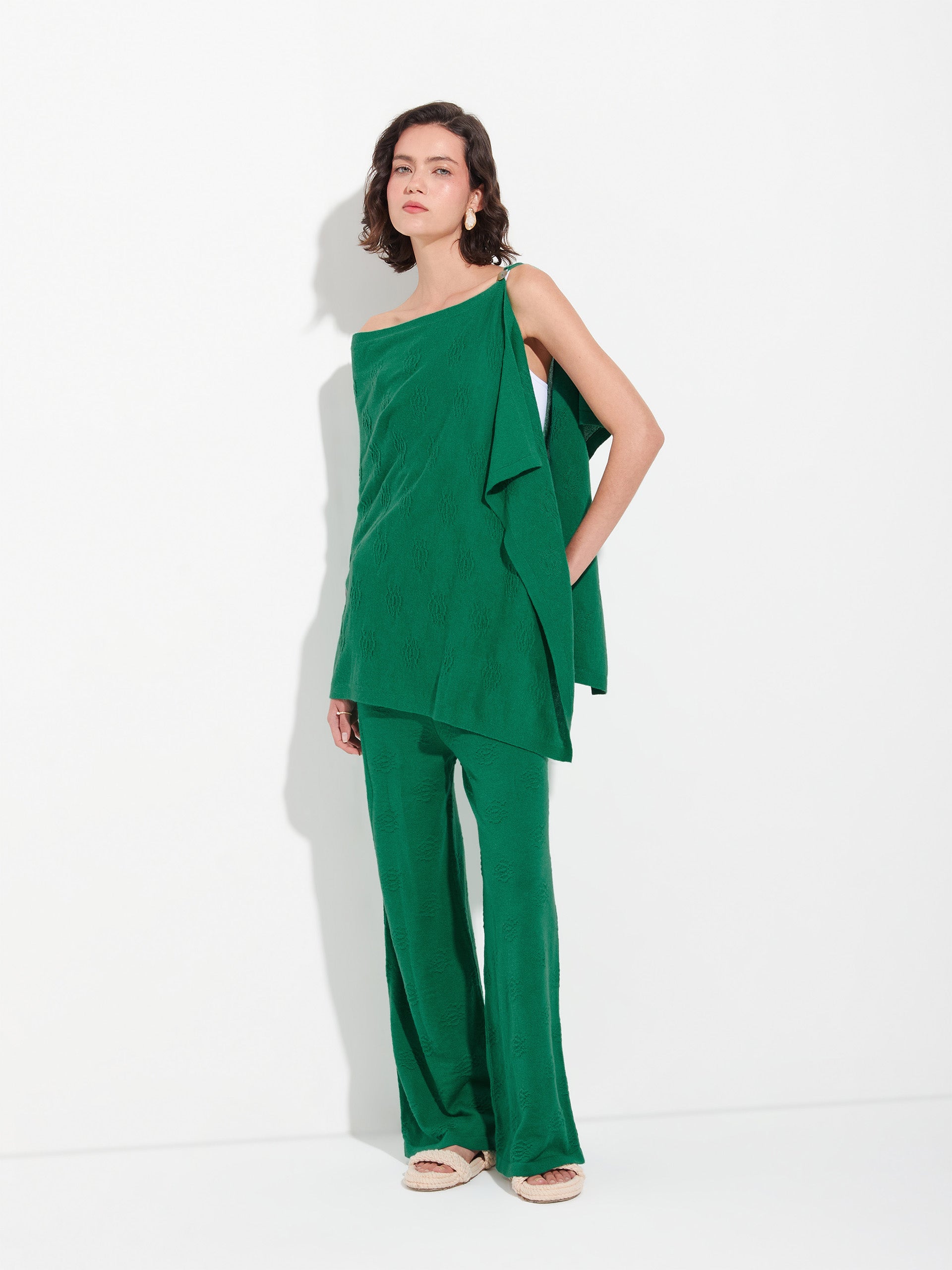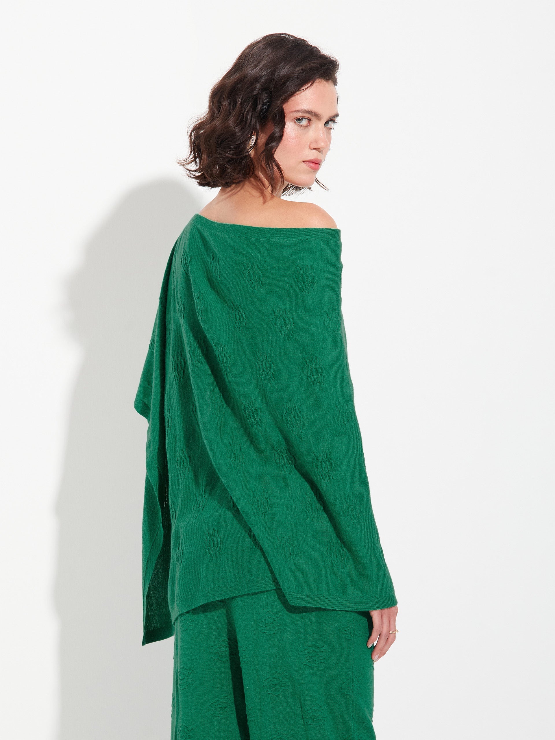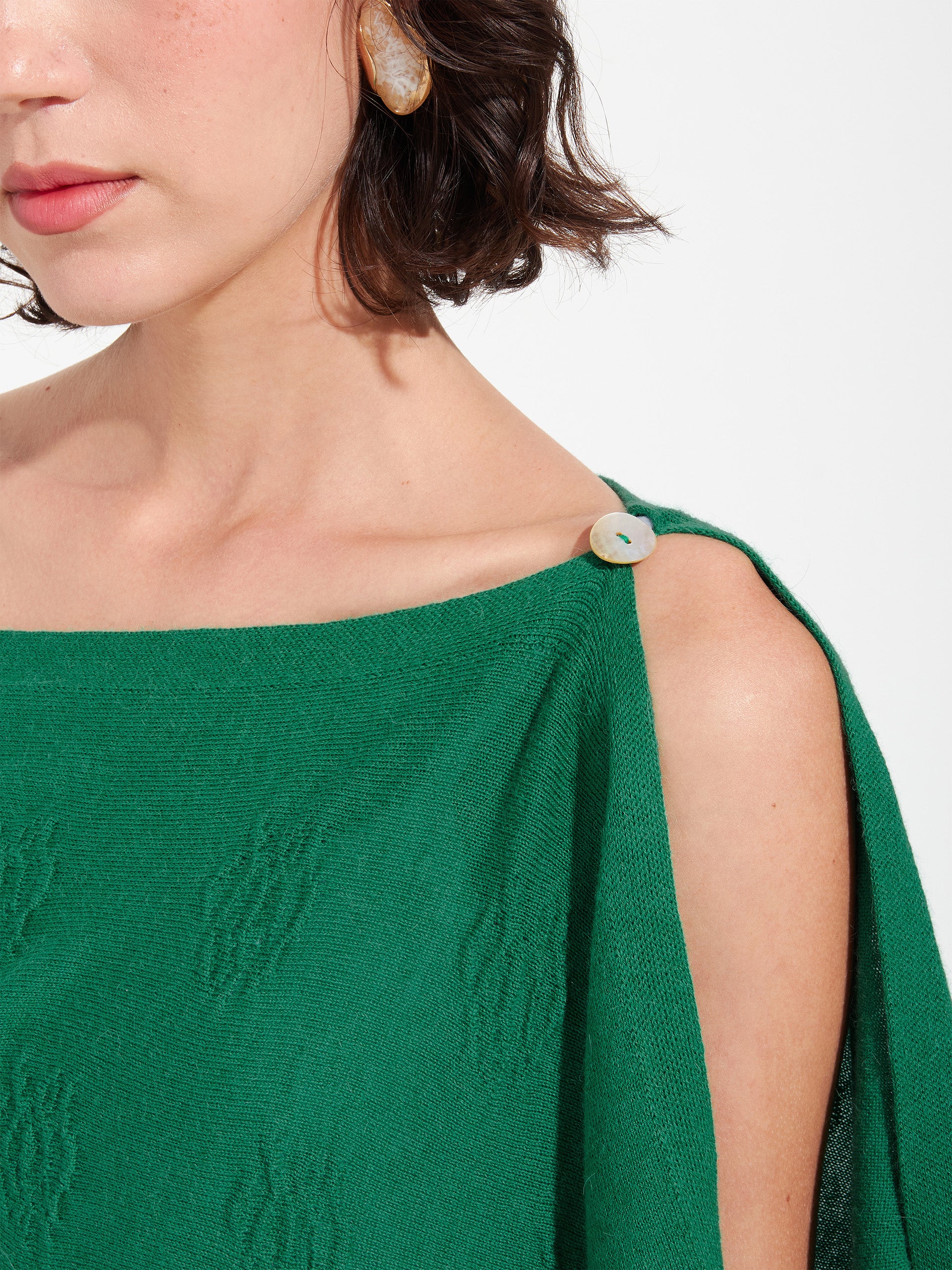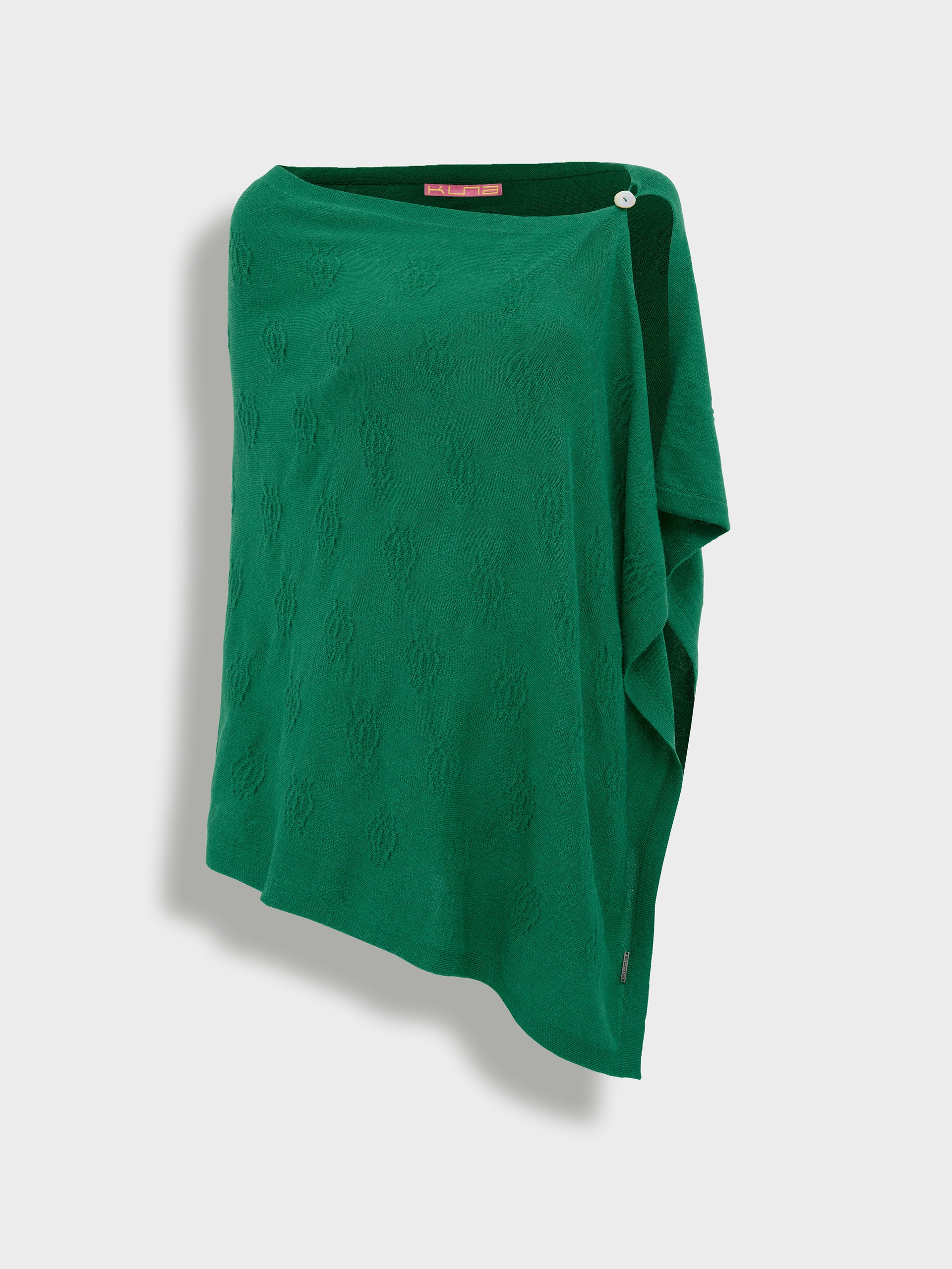 Poncho Zabeth en tonalidad verde, elaborado en algodón orgánico y baby alpaca. Presenta un diseño semiabierto con un botón y detalle de recogido en forma de rosa, que añade un toque artesanal y distintivo. | Material predominante: Algodon
