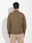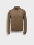 Suéter Bugatti en tonalidad camel, con cuello alto y cierre frontal. Confeccionado en 100% baby alpaca RAS y tejido en punto jersey. Presenta contraste de color en el interior del cuello y coderas integradas al tejido, que aportan un detalle funcional y distintivo. | Material predominante: Baby Alpaca